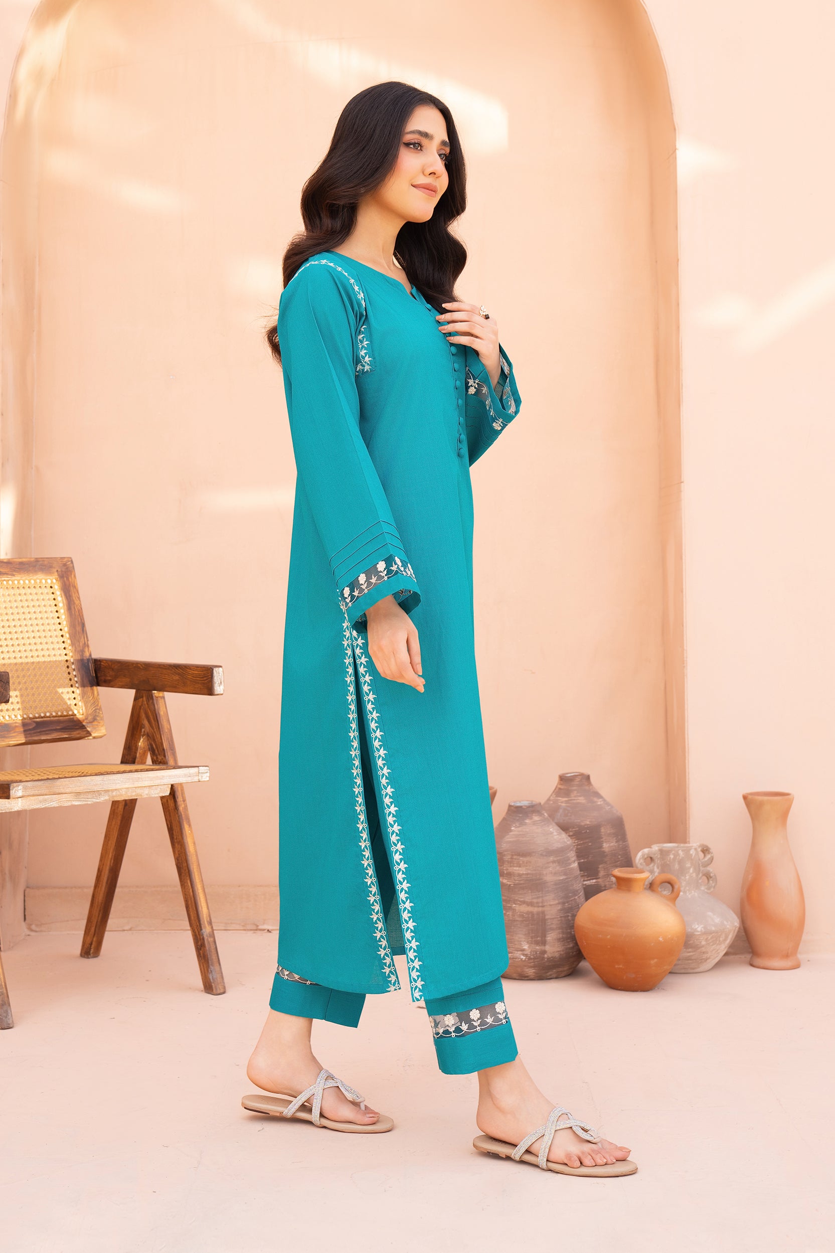 Elevate your style with three-piece embroidered article, featuring a beautifully crafted shirt and matching trousers. Intricate embroidery adds a touch of sophistication, making it perfect for any occasion. With its unique hue and luxurious fabric, this ensemble effortlessly combines modern elegance and comfort.