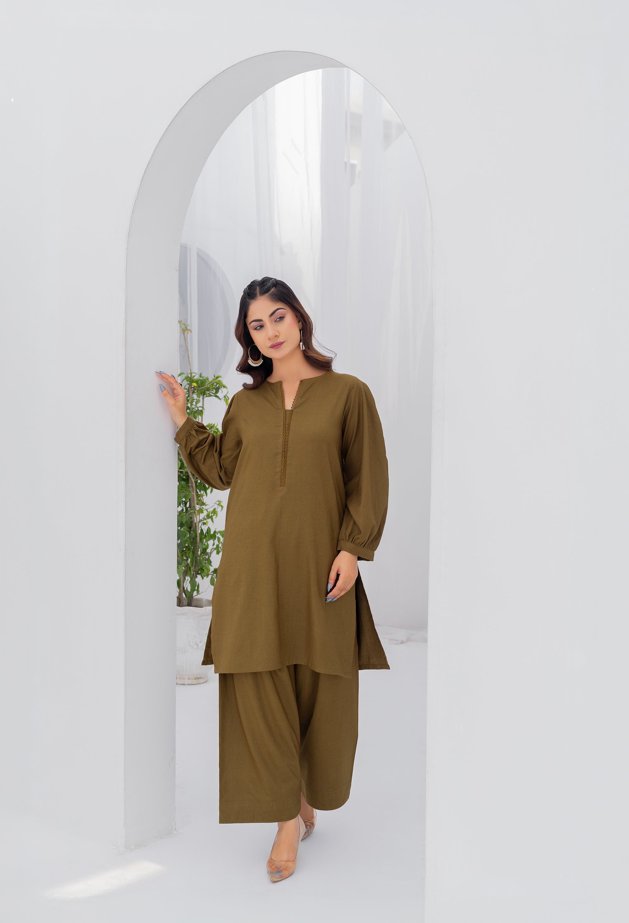 Elevate your style with our brown two-piece embroidered article, featuring a beautifully crafted shirt and matching trousers. Intricate embroidery adds a touch of sophistication, making it perfect for any occasion. With its unique hue and luxurious fabric, this ensemble effortlessly combines modern elegance and comfort.
