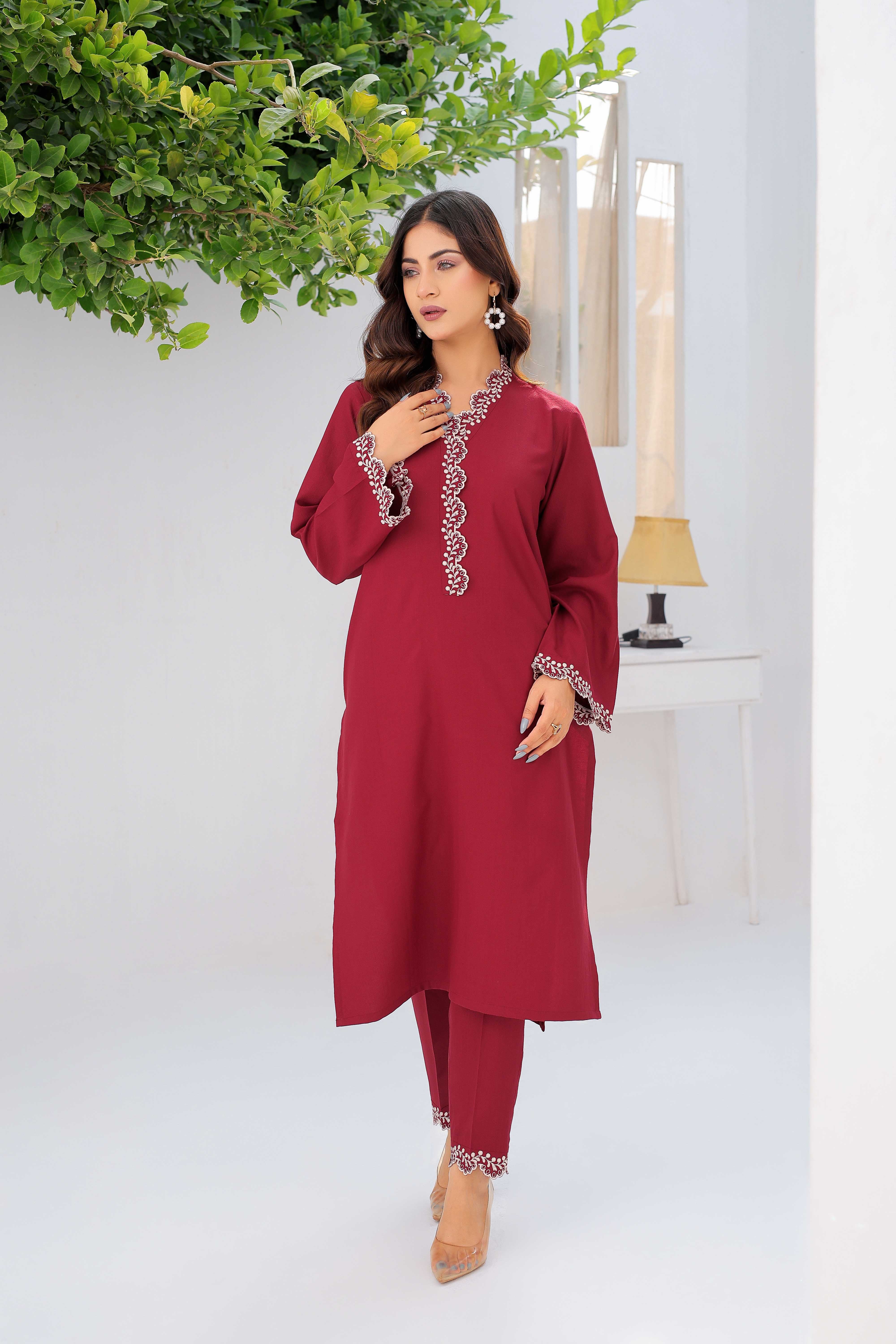 Elevate your style with our red two-piece embroidered article, featuring a beautifully crafted shirt and matching trousers. Intricate embroidery adds a touch of sophistication, making it perfect for any occasion. With its unique hue and luxurious fabric, this ensemble effortlessly combines modern elegance and comfort.